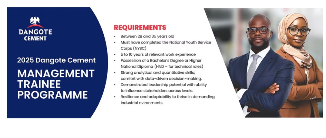 The Dangote Cement Management Trainee Programme is a prestigious 18-month programme designed to accelerate the development of high-potential mid-career professionals into future senior leaders of Dangote Cement. Successful trainees will gain cross-functional exposure, intensive classroom learning, mentorship from senior executives, and real-world project experience across plants, depots, and corporate offices.